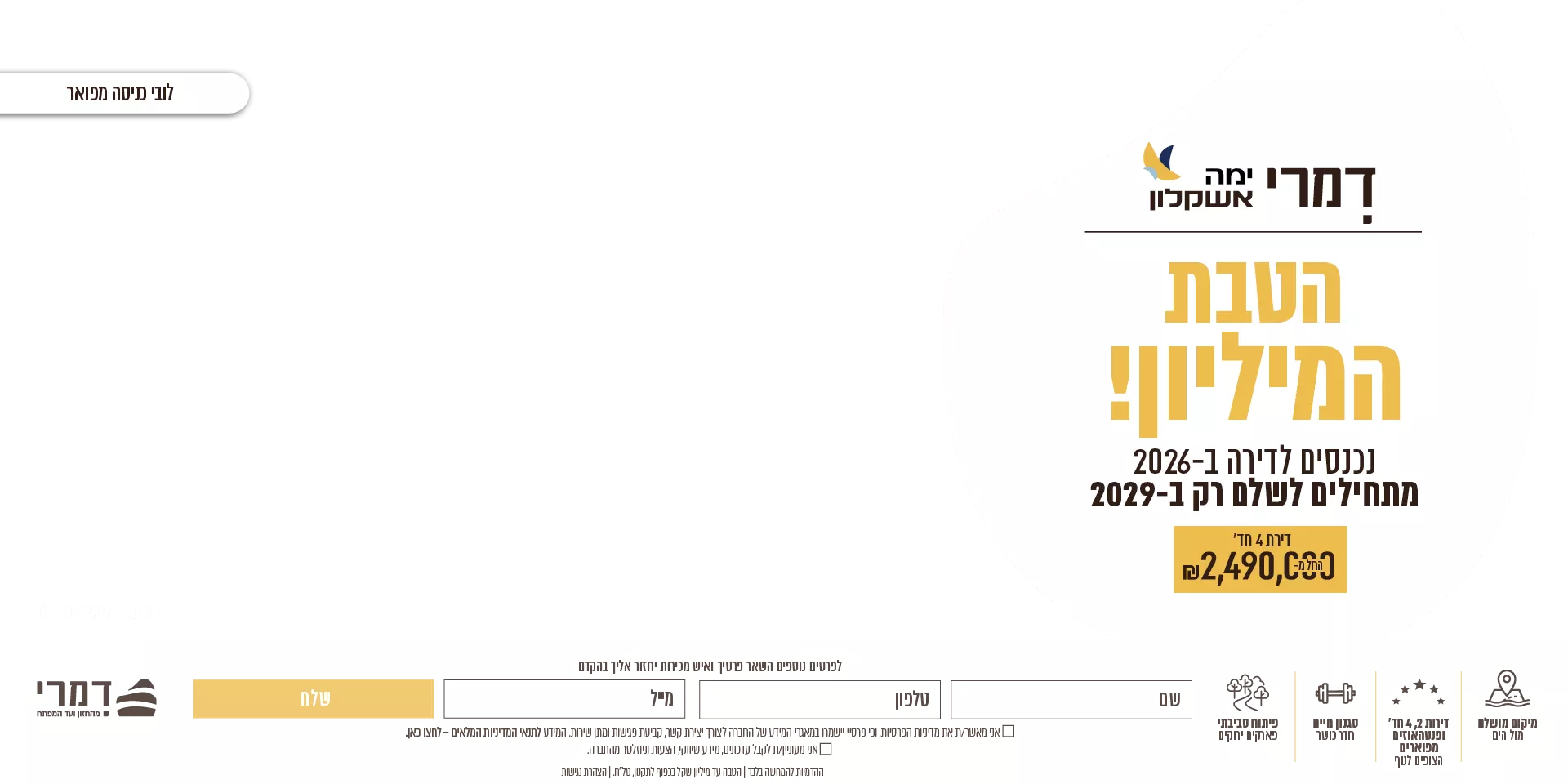 אתר זה משתמש בקבצי Cookies ובטכנולוגיות דומות לצורך תפעולו התקין של האתר, שיפור חוויית הגלישה, התאמת האתר להעדפותיך, לרבות לצורכי מדידה, ניתוח, שיווק ופרסום מותאם וזאת בידי חברת י.ח. דימרי בניה ופיתוח בע"מ, והכל בהתאם למדיניות הפרטיות של החברה. בלחיצה על כפתור "הבנתי" הנך מאשר/ת את השימוש כאמור במידע, כמפורט במדיניות הפרטיות